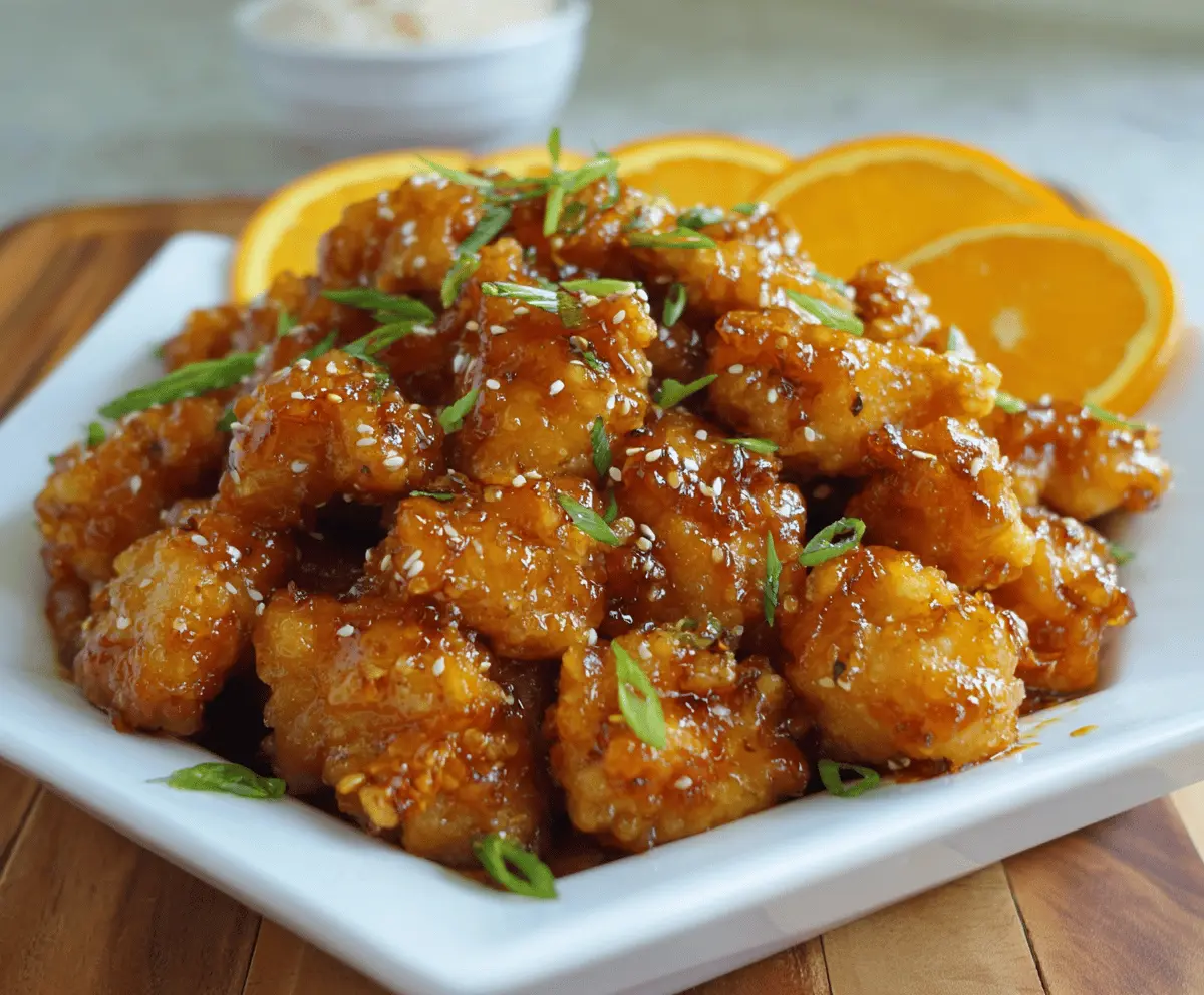 Transfer your delicious orange chicken to a serving dish and sprinkle sliced green onions and sesame seeds on top. Garnish with fresh orange slices if desired.